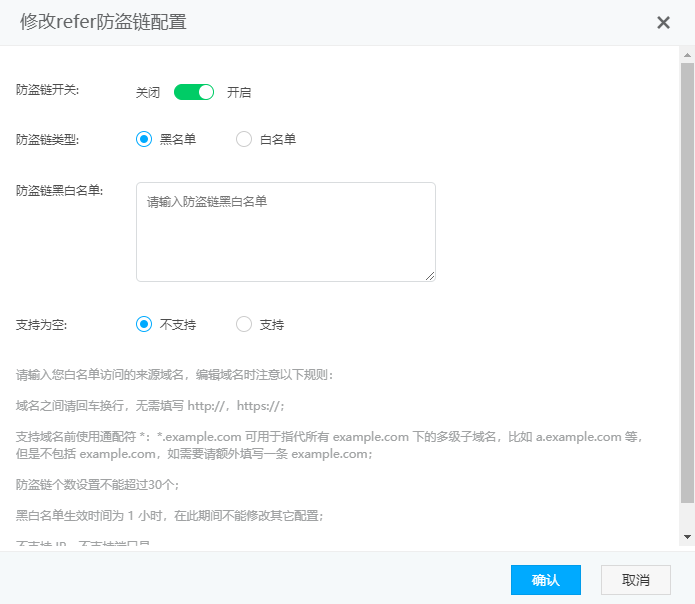 - referer防盗链:开启后可以进行referer黑白名单的配置。