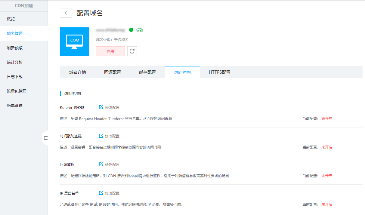 登录,进入控制台->CDN->域名管理->配置->访问控制