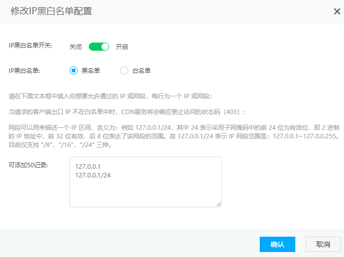为了解决恶意 IP 盗刷、攻击等问题,CDN提供了IP黑白名单配置功能