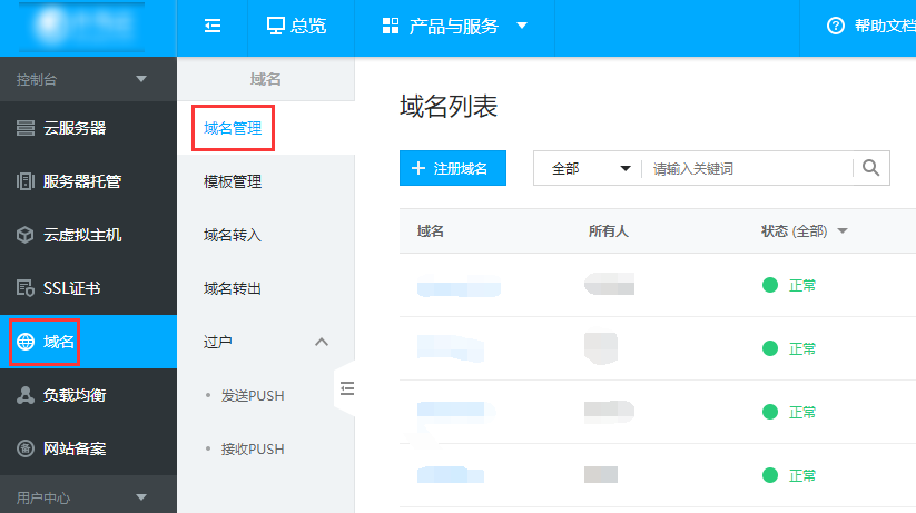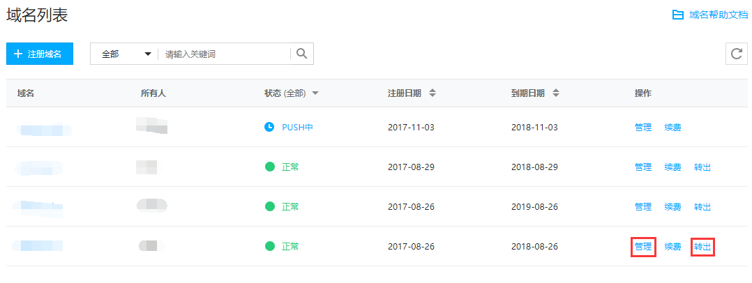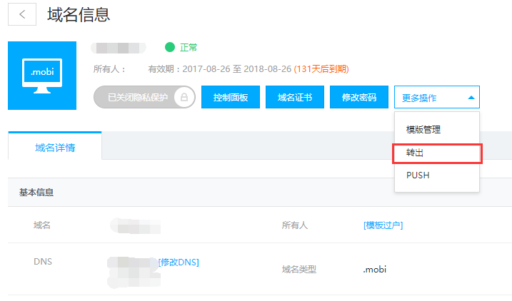 操作步骤登录,控制台->域名->域名管理。 ![]() 选择需要进行转出操作的域名,点击转出或点击管理,进入域名详情页。 ![]() 在更多操作中选择转出。 ![]() 填写转出信息。 ![]() 可在域名->域名转出中查看到域名转出信息,取消转出操作亦在此处。 ![]() |