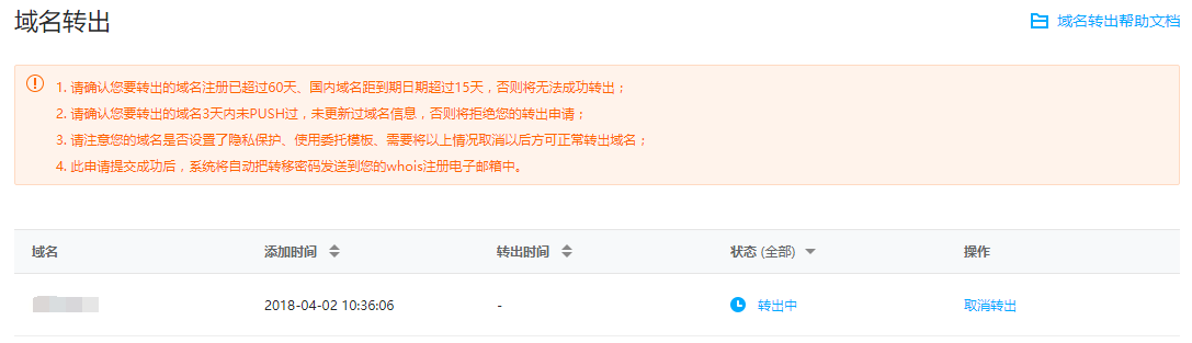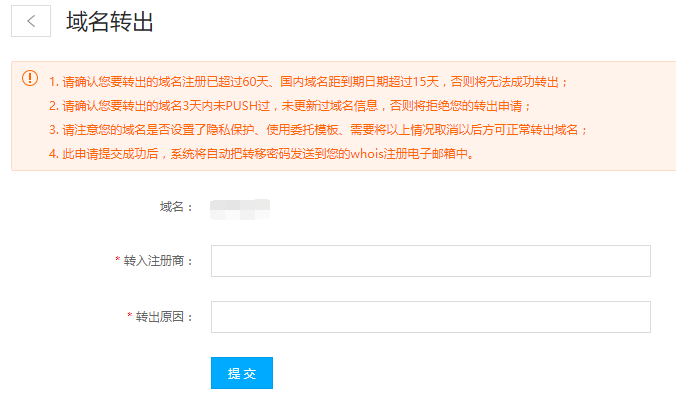 说明如用户需要将域名转移至其他运营商,可免费使用域名转出功能。