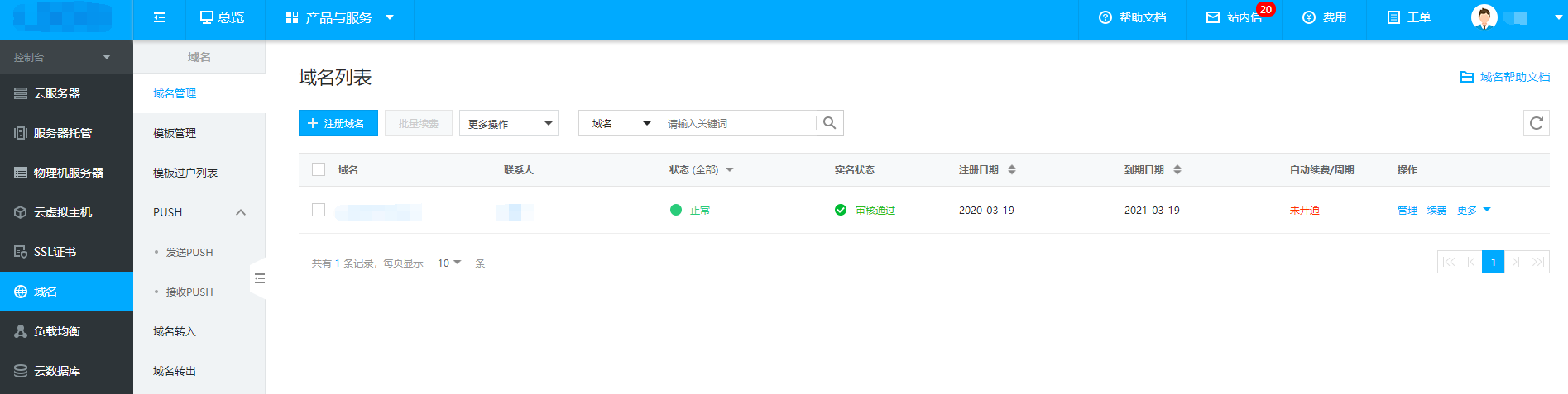 成功支付订单后即续费成功,可返回域名列表中查看域名时限。