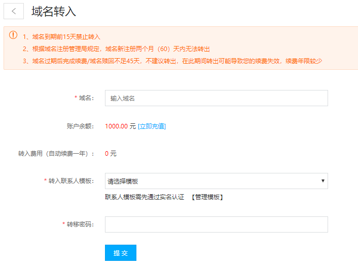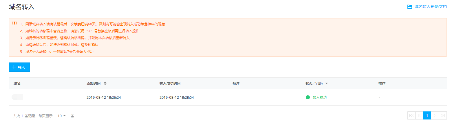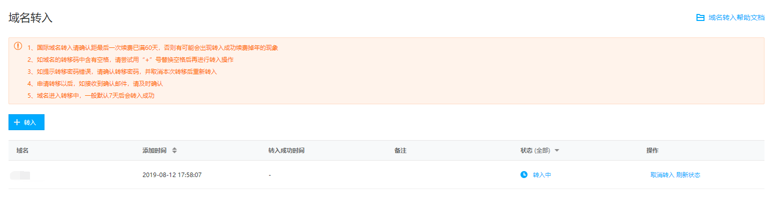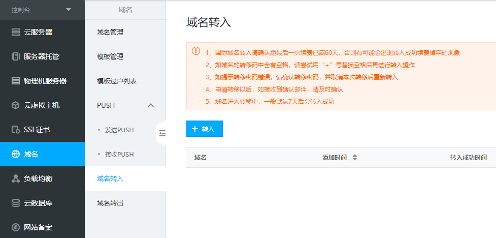操作步骤登录控制台->域名->域名转入 ![]() 填写转入信息 ![]() 在提交转移成功后,系统会根据实际情况返回转入成功时间,在转入成功时间未生成前可取消转移,否则不可取消 ![]() 没有转入成功时间,可取消转入 ![]() |