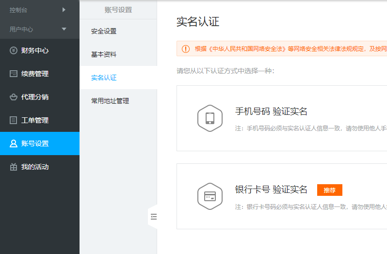 1.登录进入控制台,在左侧导航栏中-“账号设置”-“实名认证”-“银行卡号验证实名”;