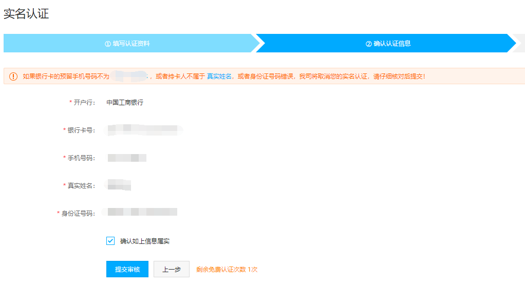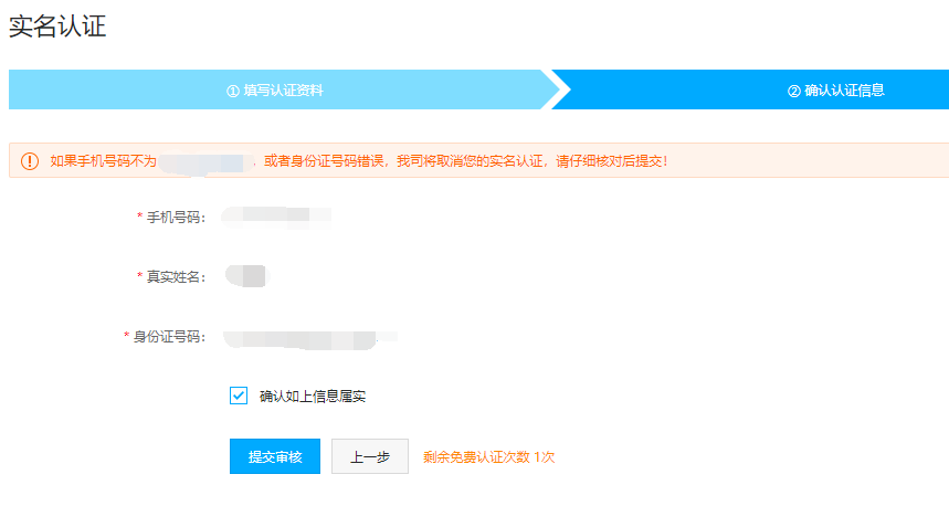 - 每次实名认证系统将自动扣取相应费用,如认证失败,费用将不予退还,请确认实名信息正确之后再提交