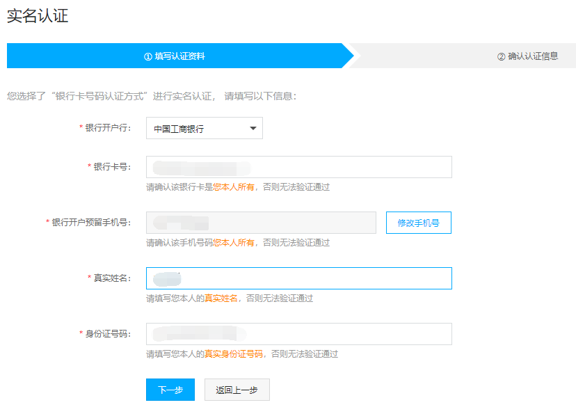 2.填写认证资料,选择银行、正确填写个人身份证姓名、身份证号码,并提供与身份证名称一致的银行卡号,单击下一步按钮;
