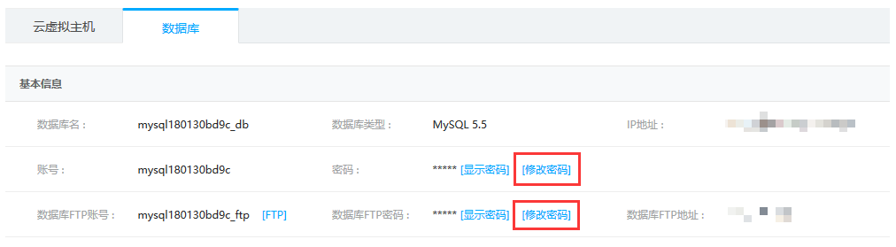 ![]() 2. 选择需要重设数据库密码或数据库FTP密码的云虚拟主机,点击管理,进入主机详情页。 ![]() 3. 进入数据库详情页。 ![]() 4. 在基本信息栏内点击修改数据库密码或数据库FTP密码。 ![]() 5. 输入新密码 ![]() 数据库升级、续费数据库空间属于云虚拟主机赠送,如需对数据库进行升级或续费操作,请前往对应的云虚拟主机进行升级/续费。 |