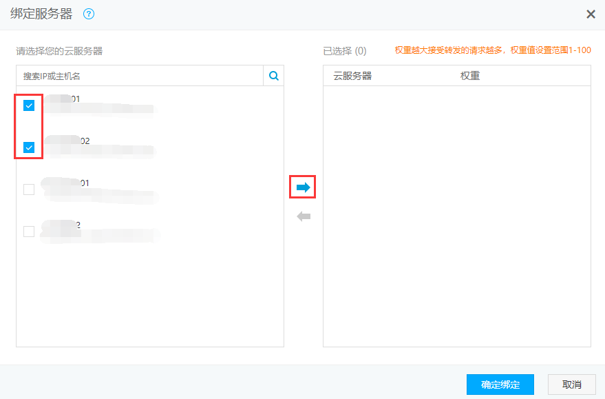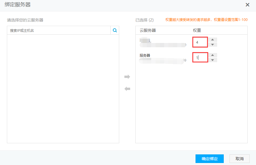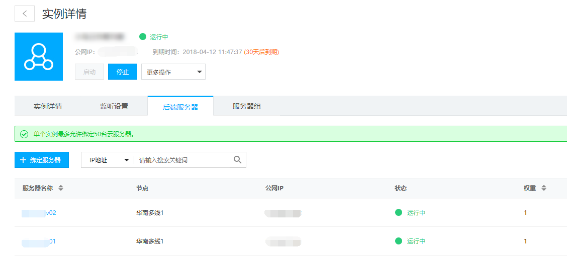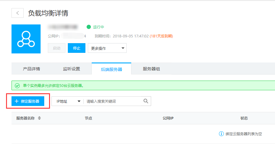 为负载均衡实例添加后端服务器 1.在控制台,选择 “负载均衡”—>“负载均衡管理”—>“某负载均衡实例ID” ![]() 2.选择“绑定服务器” ![]() ![]() 3.选定需要添加的后端云服务器