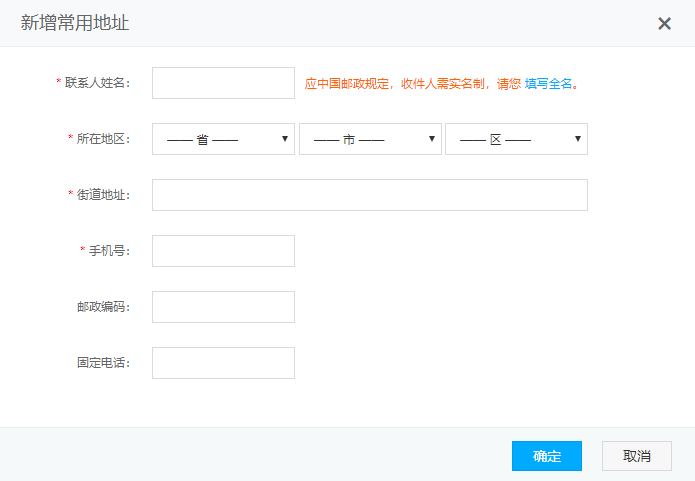 2.点击“新增地址”,填写常用地址信息,点击“确定”。