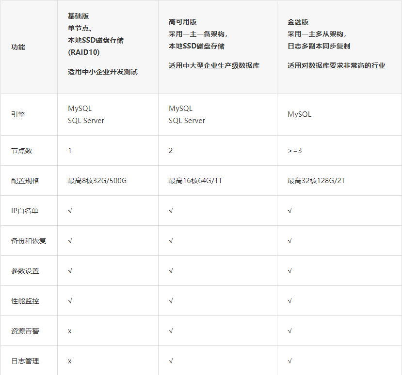 云数据库的实例包括基础版,高可用版,金融版,目前暂只支持基础版。