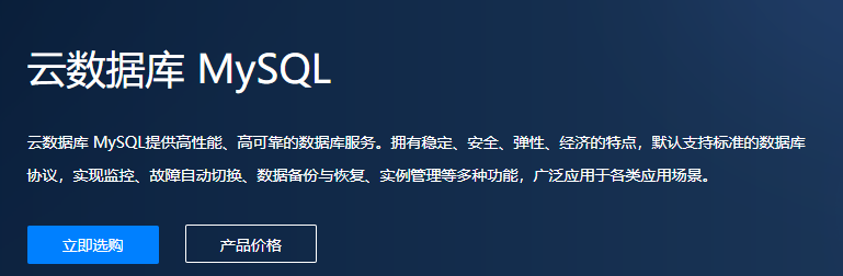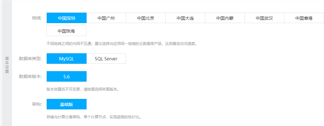 选配并购买实例1. 登录,选择产品-云数据库MySQL-点击立即选购,进入云数据库购买页。 ![]() 2. 根据您的需求选择地域,若同时使用我司云服务器,建议云数据库实例和云服务器实例位于同一地域,以实现最高的访问性能。 3. 选择数据库类型,数据库版本,架构(目前支持基础版)