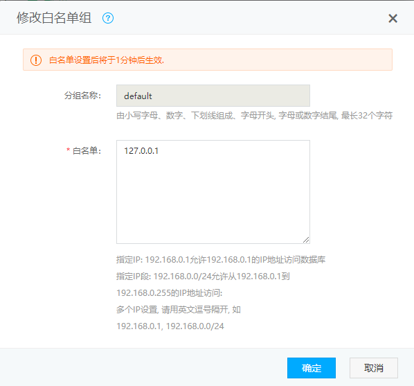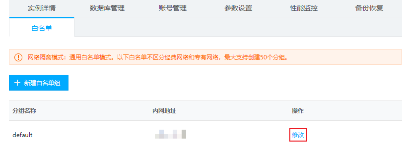 ![]() 3. 单击白名单 ![]() 4.在白名单设置页面中,单击default白名单分组中的修改,如下图所示 ![]() 5.在修改白名单分组对话框中,填写需要访问该实例的IP地址或IP段,然后单击确定