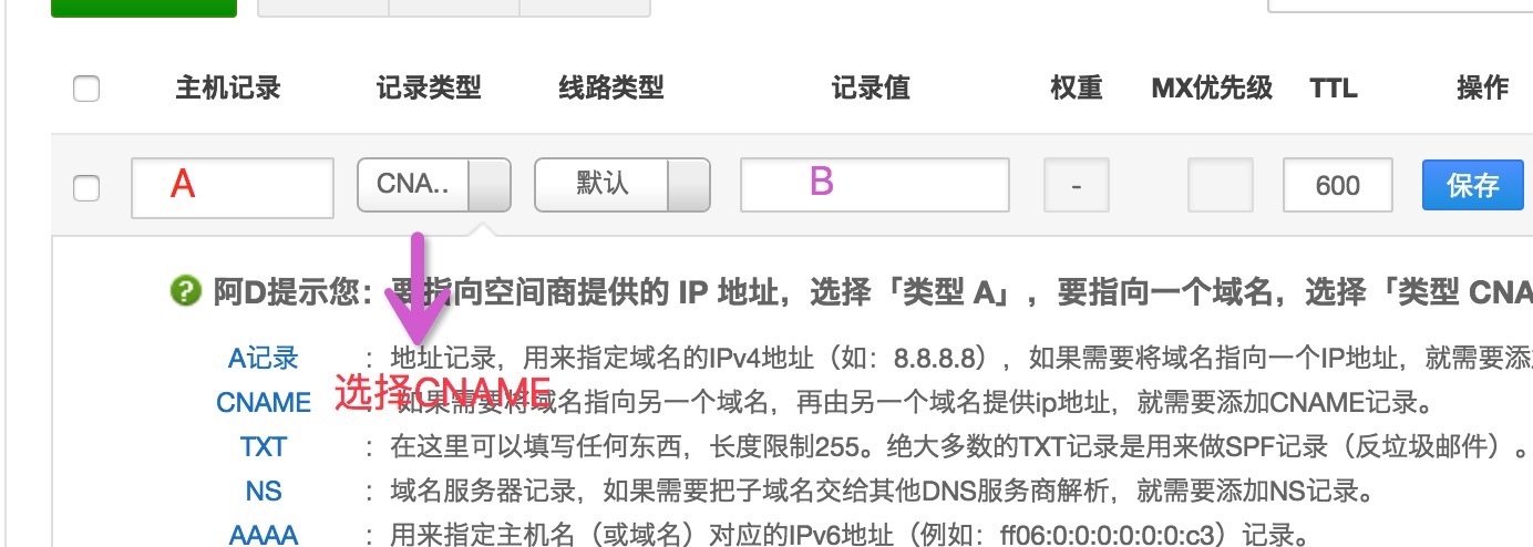 将复制到的A填到解析面板的主机记录,B填到记录值,类型选择CNAME。保存即可。