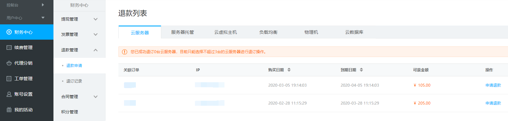 2、选择要退款的云服务器/云虚拟主机,点击“申请”;