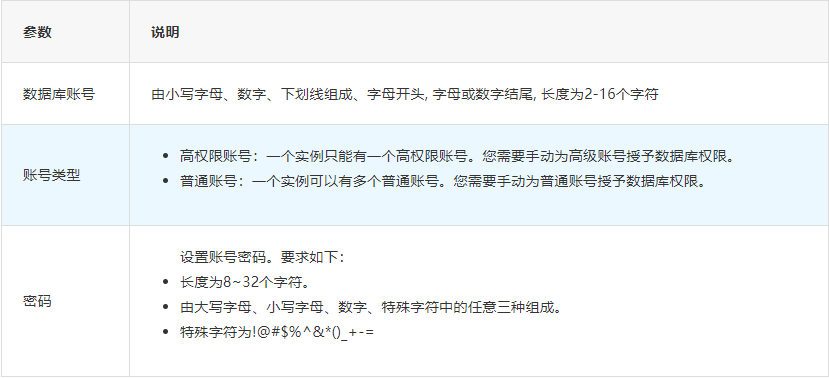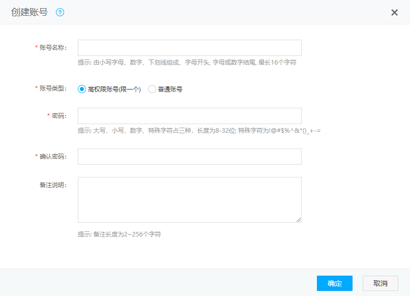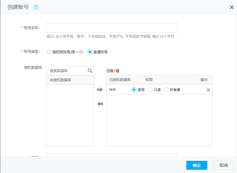 1. 单击账号管理 ![]() 2. 单击创建账号 3. 输入数据库账号信息,单击确定。 参数说明: ![]() 创建高权限账号如下图所示: ![]() ![]() 创建普通账号如下图所示: ![]() 账号创建完毕,您需要授予账号权限才能连接数据库。 初始化设置完成,参考连接SQLServer数据库实例连接到SQLServer 实例。 |