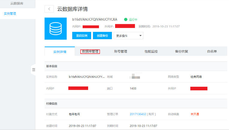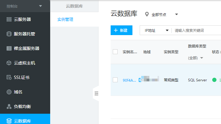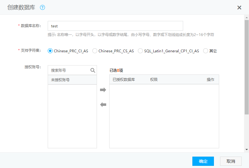 创建数据库1.登录控制台->云数据库->管理云数据库实例。 ![]() 2. 找到需要创建数据库的目标实例,单击管理 ![]() 3. 单击数据库管理 ![]() 4. 在数据库管理页面,单击创建数据库 5. 输入数据库名称,选择合适的字符集,然后单击确定 云数据库SQL Server支持的字符集: