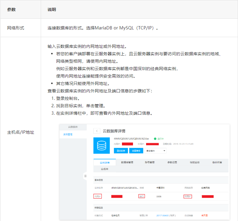 初始化配置后,您可以让云服务器连接云数据库实例,也可以本地连接到云数据库实例,实现业务目标。 背景信息完成创建云数据库实例、设置白名单和创建账号等操作后,您可以使用通用数据库客户端连接到云数据库实例,也可以在应用程序中配置地址、端口、账号信息等进行连接。 使用客户端连接实例由于云数据库与原生的数据库服务完全兼容,所以您可以使用任何通用的数据库客户端连接到云数据库实例,且连接方法类似。下文以HeidiSQL为例。