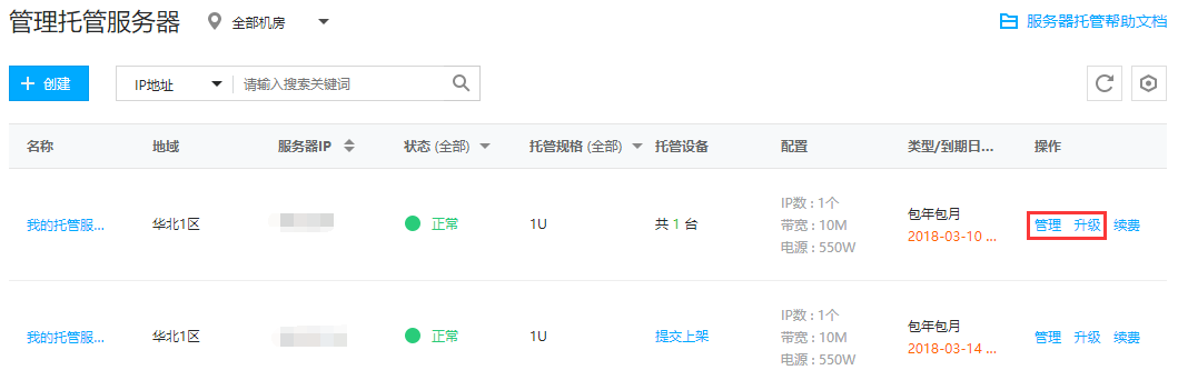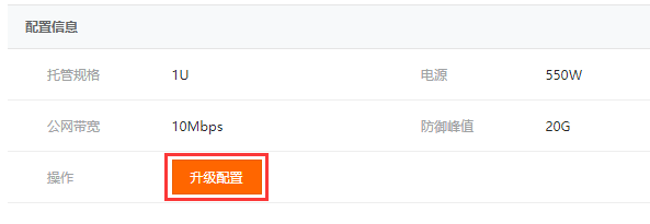 选择您需要升级的托管服务器,点击升级,或进入服务器管理页的配置信息中点击升级配置。